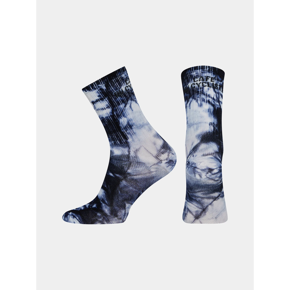 With a classic sports tube sock construction, these high cuff chaussettes have been tied and dyed for a freewheeling aesthetic on tarmac, trails or transition. Every pair is unique, with a slightly different pattern on each due to the production process.