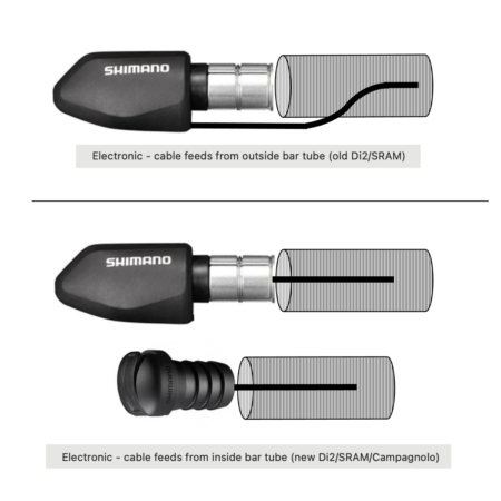 NOTE: Not compatible with older Di2 shifters where the cable enters the bar from outside the bar tube (see images for example).
