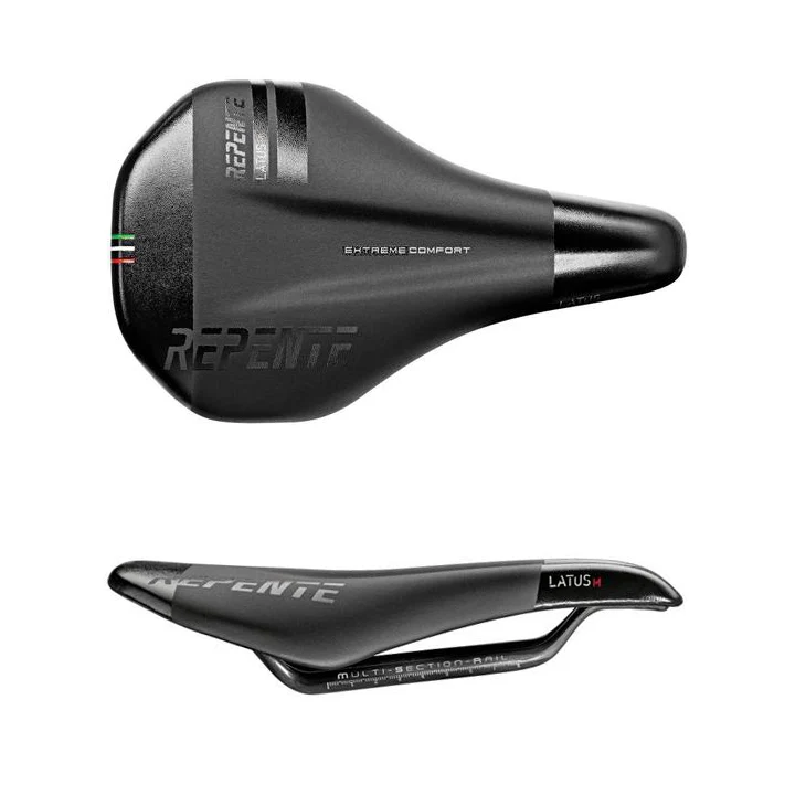 Wide but not too wide, lightweight and amazingly comfortable. Latus M is the full carbon saddle for cyclists who prefer a slightly wider fit than traditional saddles. Its 142 mm width is one of the standard dimensions most in demand commercially in the wide seat range. The materials and construction concepts used reflect those of the CL model: from autoclave processing of unidirectional carbon fibre to the differential section rail, and from the wide longitudinal anatomical channel to the Eva padding, shaped to ensure adequate support even in the seat tip area. Latus M dimensions are 240mm x 142mm. Its weight does not exceed 140 grams. It is a saddle suitable for both road riders and offroad enthusiasts. Its compact size and the shape of the front enhance freedom of movement during pedalling. Its level of finishing highlights Repente’s trademark attention to every detail – a common feature shared by all its products.