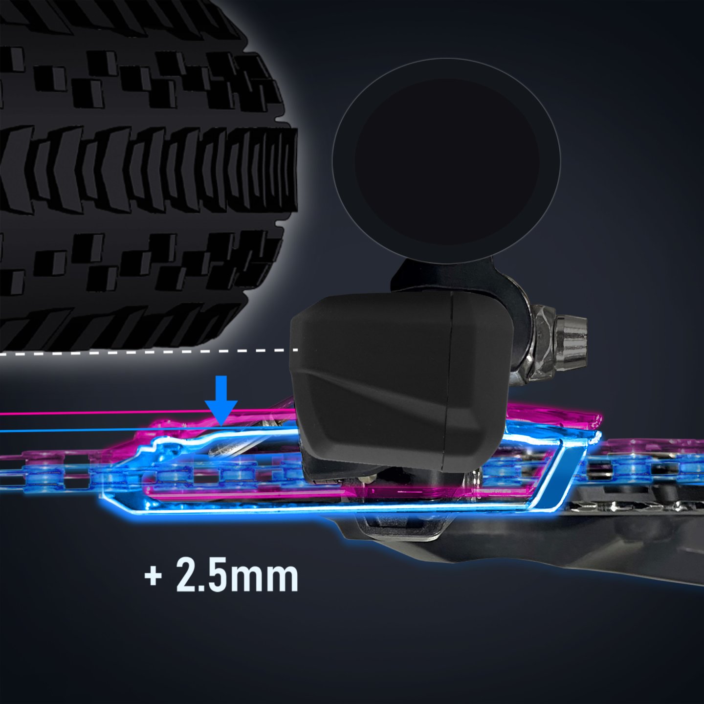 The 2.5 mm outward offset chainline of the front derailleur for 2×12-speed drivetrains not only offers more tire clearance, but is also ideal for riding on mixed terrain. By adapting the 17-tooth chainring difference of the FC-RX820-2 crankset (sold separately), the FD-RX825 front derailleur also covers a wide gear range. To further improve customizability, an operation also is possible via the FRONT SHIFT NEXT function, which transports the chain to the chainring that is not being used just with the help of a single button on the ST-RX825 brake/shift lever (sold separately).