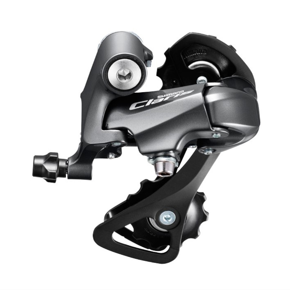 Shimano Claris RD-R2000 rear derailleur with short cage. It is compatible to cassettes with up to 32 teeth. The wide link design increases the stiffness for smooth shifting performance and long durability.