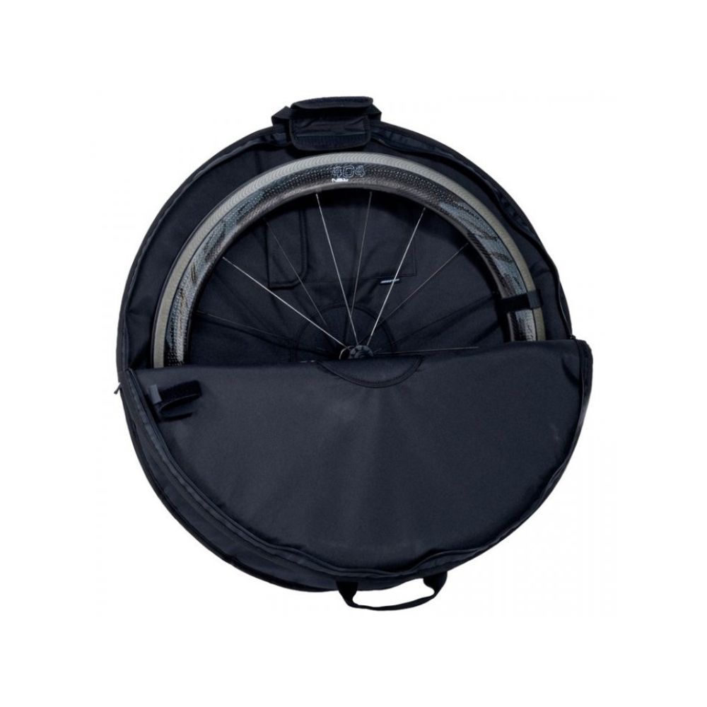 The bag fits up to a 700x35c tire and features an inner pocket for quick release storage, internal Velcro straps to secure the wheel, and a padded, Velcro-secured handle for comfortable transport. Fully padded with a rugged 840d nylon outer shell and an extra layer of hub reinforcement, this bag ensures that your valuable wheels will survive trips to and from races for years to come.